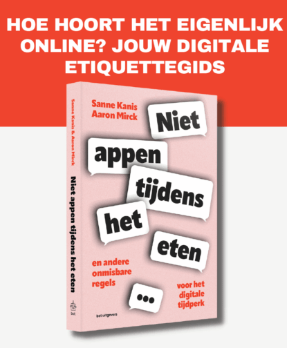 Aaron Mirck en Sanne Kanis schreven een grappige en handige handleiding voor de 21e eeuw. Een ideaal cadeau voor die collega, vriend of familielid die eigenlijk niet weet hoe het online heurt. Niet appen tijdens het eten is een handige en grappige gids voor iedereen die struikelt over de ongeschreven regels in het digitale tijdperk. Aan de hand van digitale ergernissen en ongemakken maken Kanis en Mirck de lezer wegwijs in een wereld van videobellen, dickpicks, TikTok-dansjes, zelffeliciterende LinkedIn-posts, teleurstellende dating-apps, schermtijdoverdosis, uitgeknepen flitsbezorgers en irritante groepschats. Ongemakken en onzekerheden behoren tot het verleden met deze praktische en geestige handleiding voor digitale omgangsvormen op het gebied van werk, familie, liefde, vrienden, opvoeding en privacy. Ideaal voor de collega die steeds te laat inbelt op Zoom-calls, de vriend die elke maaltijd en wielrenrit post, de zus die al haar dates ghost en de buurman die zijn kindjes als influencer in de dop opvoedt. Evert de Vries, oprichter van Bot Uitgever: “We herkennen allemaal de ongemakken van de moderne tijd. Wie wel eens in een groepsapp heeft gezeten waarin een complottheorie gedeeld werd of zich ergerde aan iemand die appte tijdens het eten, maar niet goed wist wat daarvan te zeggen: dit boek maakt je wegwijs. Met gevoel voor humor - en aan de hand van advies van experts - geven Kanis en Mirck handvatten voor een fijn leven in de 21e eeuw.” Nieuwsgierig geworden? Schrijf je hier in voor de nieuwsbrief en ontvang de eerste hoofdstukken nog voor verschijnen in de mail: Sanne Kanis is auteur en oprichter van Abel Entertainment: een productiestudio die een schermloos alternatief biedt voor kinderen en families. Kanis had een wekelijkse column in Het Financieele Dagblad over technologie, publiceerde de roman De bubbel en een columnbundel Digitale Dilemma’s: hoe technologie ons leven beïnvloedt. Eerder werkte ze op strategische posities voor Google, Spotify en Booking.com. Aaron Mirck is publicist en schrijver. Hij publiceerde een dichtbundel over technologie: Dit algoritme deugt niet en managementboek Alles wat PR-bureaus je niet vertellen. Regelmatig schrijft hij opiniestukken over technologie, onder meer in NRC, het Parool, de Telegraaf en Elsevier. Eerder werkte hij als journalist, als tekstschrijver voor tech-bedrijven en als co-founder van tech-startup Presscloud.Je kind zit aan tien uur schermtijd per dag - wat te doen? Is het oké om een date uitgebreid te googlen? Wat doe je als jij je schoonmoeder per ongeluk een pikant bericht stuurt? Mag je een match ghosten? Kan je echt geen zakelijke e-mails vanuit je privémail sturen? Hoe reageer je als in de familie- app een complottheorie wordt gedeeld?